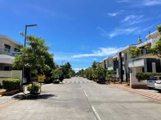 自宅前の道路から眺めるゲートソサエティ(戸建て住宅群)の敷地には、野良犬も不法駐車もなく、住宅が整然と立ち並ぶ閑静な住宅街です。