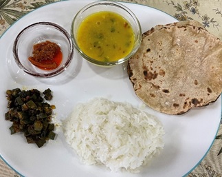 写真左:ロティ(丸いパン)から時計回りに白米・ベジタブルサブジー(刻んだ野菜の炒め煮)・マンゴーピクルス・ダル(豆のスープ)