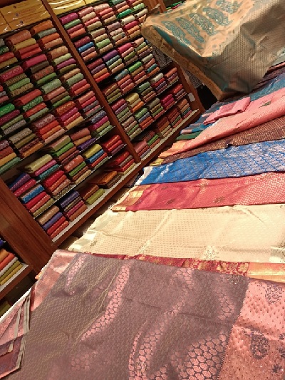 チェンナイ産シルクのお店では、サリー生地を広げてお客さんに見せてくれます
