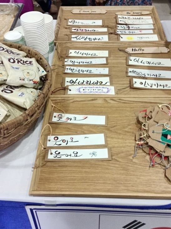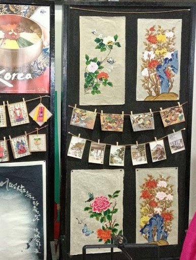 韓国・ブースからは繊細な刺繍の展示やハングル文字のしおりやお菓子など