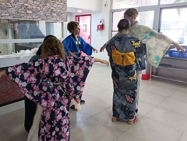今回、筆者は「浴衣体験」の準備に協力しました。来場者の身長に合わせて、120㎝から170㎝の身長に10㎝刻みで対応できるように、また、短時間(約3分)で着付け体験ができるよう「おはしょり」(着物や浴衣の丈を調整するために折り上げる部分)のしつけをしました。また、子どもの浴衣と同様にすべての浴衣に腰ひもを半裁したものを胸前に縫い付け、着付けの時間短縮に備えました。休日や平日の夜に家で一人静かに運糸をしながら、久しぶりのお裁縫に心の平穏を感じました。浴衣を着た外国の子どもたちや母親たちが嬉しそうに写真を撮ってはしゃぐ姿を見ながら、私たち日本人の着付けスタッフも自然と笑みがこぼれました。