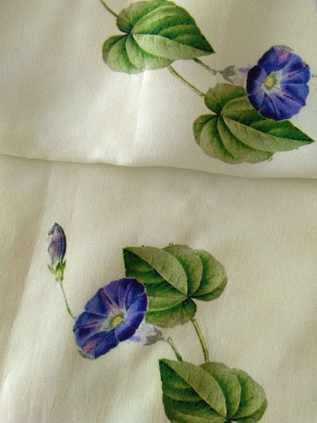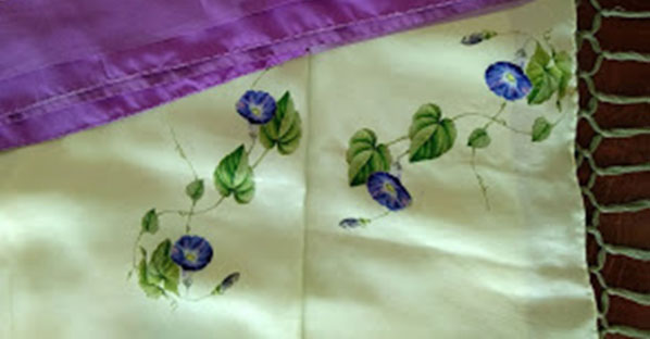淡い若草色の無地に濃紺の朝顔の花と萌黄色の葉、そして桔梗色の縁取りのサリーです。華やかな色を好むインド人の文化とは異なっていることは誰の目から見ても明らかです。「これは、もしかして日本の着物ですか?」と質問すると、デザイナーであるオーナーさんは「まさにその通りです。私が日本の着物からインスピレーションを得て、日本の工房で特別にサリー生地として生産してもらいました」との返事でした。私は、迷わずその場で購入を決め、サリーの下に着用するブラウスは、着物の袖を模した形で注文してみましたが、日本とインドの日印折衷のサリーはどんな風に出来上がるのか、今からとても楽しみです。