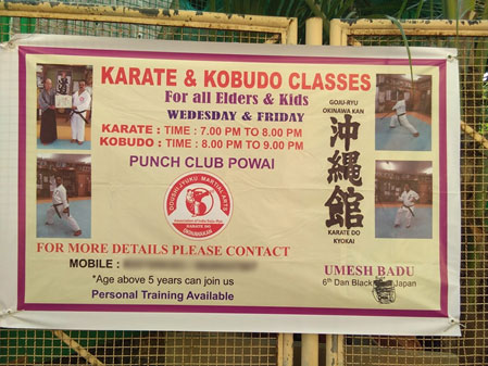 家の近所を歩いていると、子どもたちの元気な声が音楽とともに聞こえてきました。マンションのお祭りです。特設ステージの上では、空手の道着を着たインド人の子どもたちが「いちっ! にいっ! さんっ! しいっ!・・・」と日本語で数を数えながら、型を披露していました。大音量のノリの良いボリウッド音楽をBGMに、夕暮れ時の暗がりの中、赤や青の照明がステージに当てられています。ミラーボールが回る中で、子どもたちは、身体を揺らしてリズムを感じながら、空手の型を次々に披露しています。中には宙返りをする子どももいました。果たしてこれが正しいのか間違っているのか、私には判断ができません。「空手」がショーとして演出され、お祭りのステージに立っているのではないかと思いましたが、その日だけでなく、日ごろのレッスンでも同じように賑やかに楽しんでいるそうです。インド人の先生ならではと笑ってしまうような教え方でしたが、空手を習う日本の子どもたちが見たら、さぞ驚かれることでしょう。