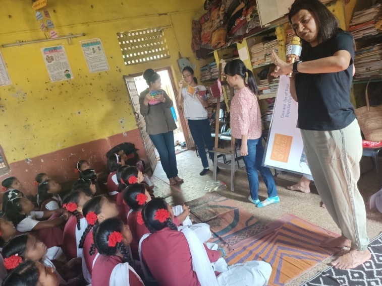 次に、この生理用品キットをムンバイ郊外の農村の学校に届けに行きますが、ここで大きな壁にぶつかります。先にも記したとおり、インドの都市部から離れた郊外の地域に行けば行くほど、女性の生理を理解し、受け入れることができる人が少なく、難しくなります。この「Day For Girls」の活動を理解し訪問を受け入れてくれる農村地域の学校が、ムンバイにはどのくらいあるのでしょうか。こうした活動を受け入れ可能な学校を探し出すことも、このボランティア活動の一つであるそうです。みなさんの地道な製作活動や学校訪問に漕ぎつけるまでの長い道のりは、半年に一度、車に揺られて、ムンバイから農村まで往復8時間かけてキットを届けに行く大変さをはるかに超える、茨の道であると想像できます。そのボランティア活動を支える皆さんの思いや、日々の生活の中から定期的に時間を作り、地道にボランティアとして活動を継続されていることに驚き、感動しました。