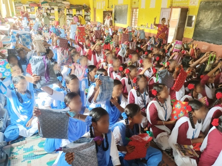 訪問先では、7歳から15歳の女子学生約200名を対象に、生理周期の正しい理解及び生理用品の扱い方について講義をした後、生理用品キットを1人ずつに手渡します。