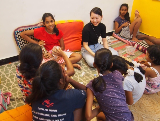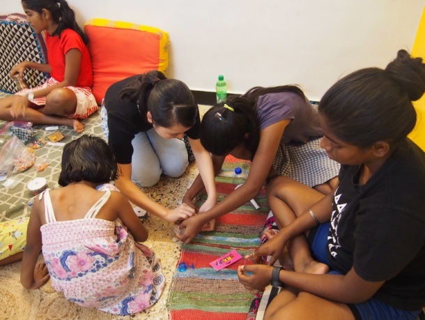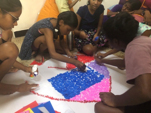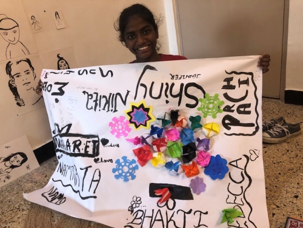 このガールズシェルターは「Sharanam」と呼ばれ、インド人とアメリカ人の支援により設立された施設です。毎週土曜日に1時間、ももさんが1人で計画し、切り絵、ちぎり絵、折り紙、ミサンガ作り、習字、万華鏡作りなどのアート創作活動をシェルターの女性たちと一緒にしているそうです。材料持参で子どもたちにやり方を教えながら製作します。年齢層は6歳から17歳と幅広く、ボランティアをする側とされる側という関係ではなく、友達という感覚で活動しているそうです。積極的に活動に参加する子もいれば、ただその場にいるだけの子もいますが、何かを強制することはなく、のんびりとした雰囲気の中で活動しており、あたたかく居心地の良い時間と空間になるよう心がけているそうです。