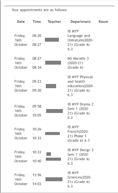 10月末には、前期中間試験が終わり、その成績をもとに個人面談が行われます。これは保護者が希望すれば、すべての教科の先生と個別に面談することができます。面談の予約管理システムも学校オリジナルのプログラムが開発され、専用のサイトへのリンクがメールで送信されてきました。サイト上で面談を希望する先生の名前をクリックすると空き時間の一覧が表示されるので、保護者の都合に合わせて予約することが可能です。筆者は面談日の終日、予定を空けて臨みました。予約サイトで「すべての教科担任」をクリックして、予約時刻を「自動」と設定すると、すぐさま1日の面談スケジュールが分刻みで提示されました。これにはとても驚きました。こうして一人の先生につき7分間の面談時間が確保されました。