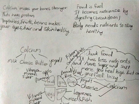 学校の授業は、ホワイトボードの壁面への板書とプロジェクターにより行われており、教師や子どもたちが英文を手書きで壁面に書き込みながら授業を進めます。また事前に各自ワークシートを使用して、自分の考えを整理したりみんなの前で発表するための下書きを書いたりするなど、一斉授業に備えた個人やグループの学習時間が多くとられているようです。学習に必要なノートや筆記用具などの文房具、教材などは年間の授業料に全て含まれているため自宅から持っていくものはほとんどありません。制服やバッグも全て学校から年度初めに支給されます。