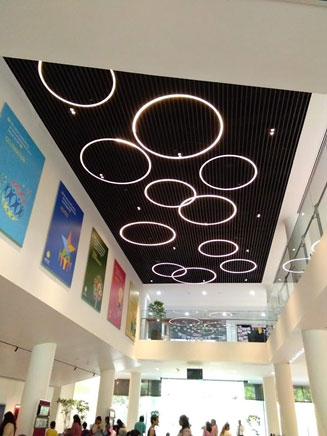 吹き抜けのロビーだけでなく、人工芝の校庭、幼児の水遊びプールなども全て屋内にあります。日差しの強いインドでは幼児期に強い紫外線を浴びたり、大気汚染の激しい戸外に出たりすることを避けています。