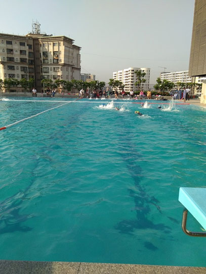 屋上には人工芝のグラウンドとプールがあります。小学校高学年や中高生が使用するプールは、50メートル×10レーンと大きく、2クラス合同の体育に4人の教員と10名の監視員が付きます。