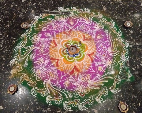 各家庭の玄関に手作業で描かれるディワリを祝う砂絵(ランゴーリ)